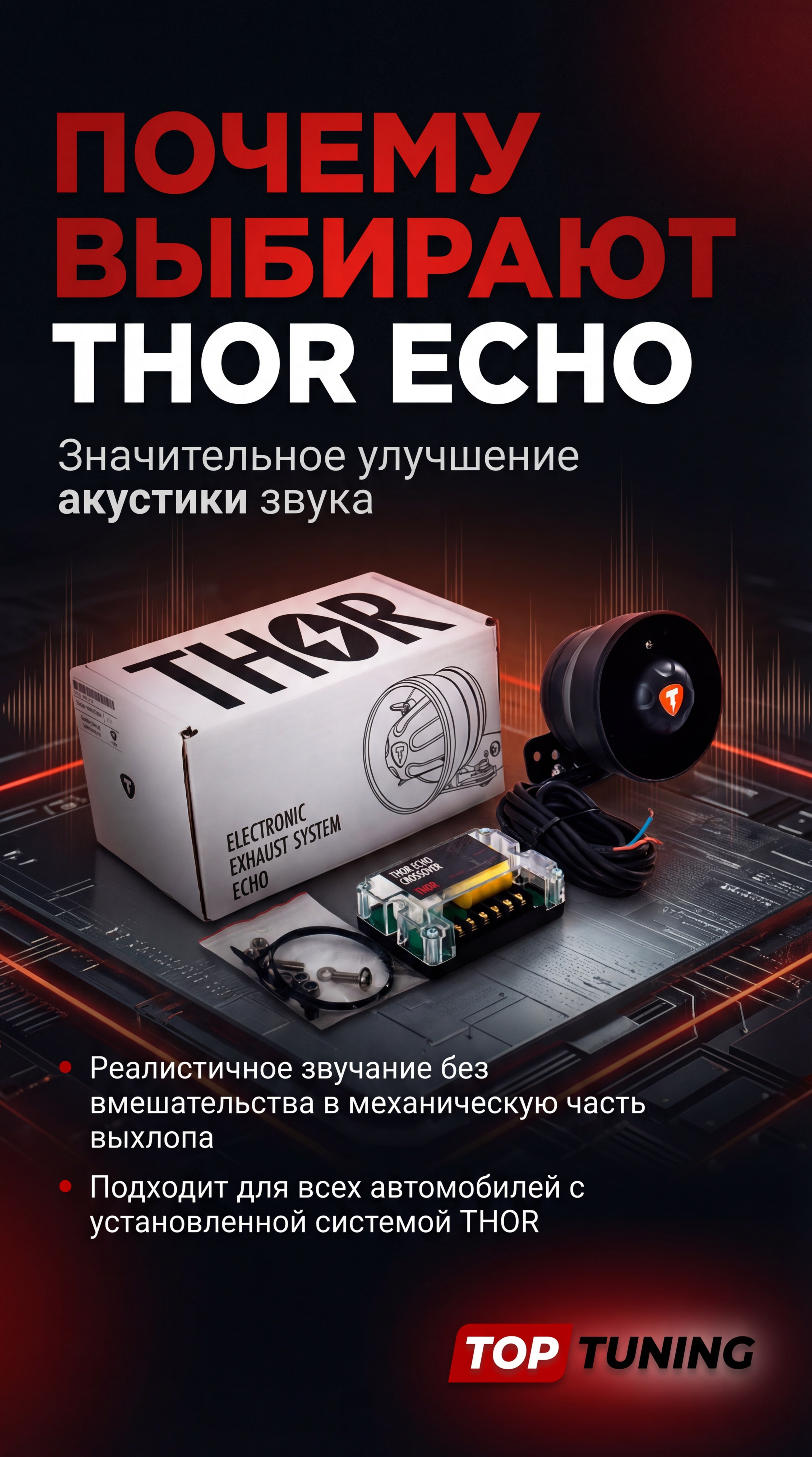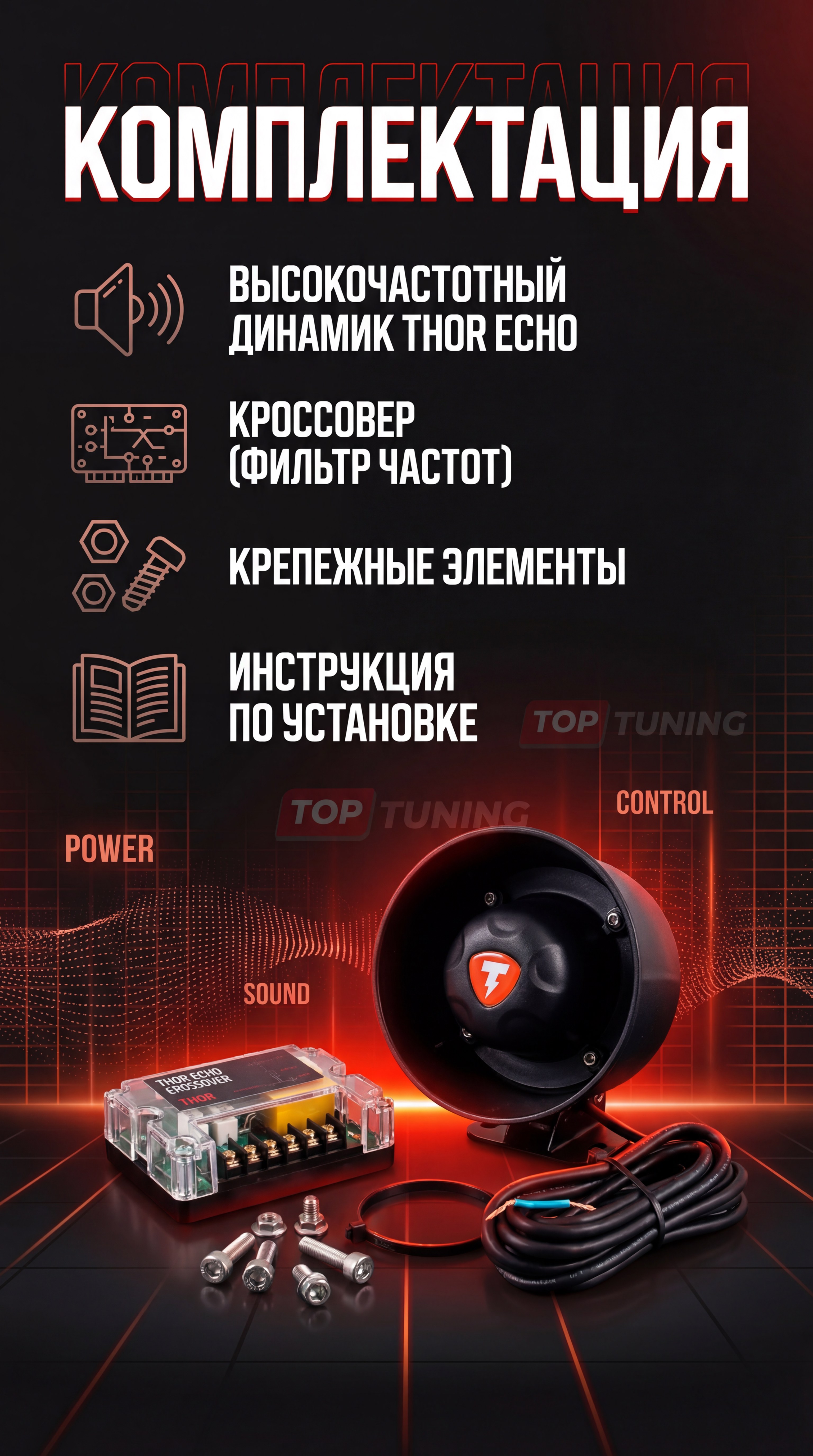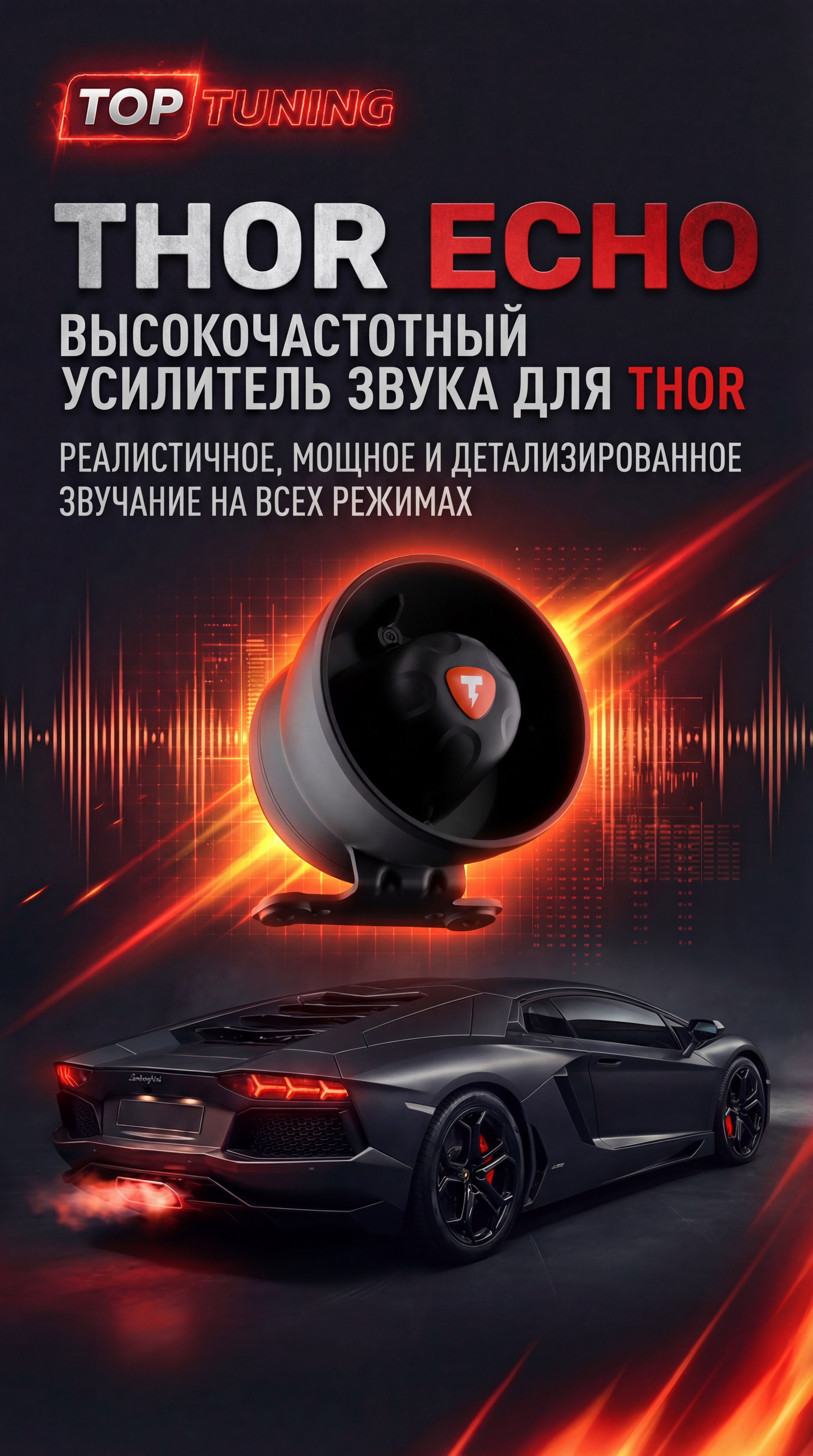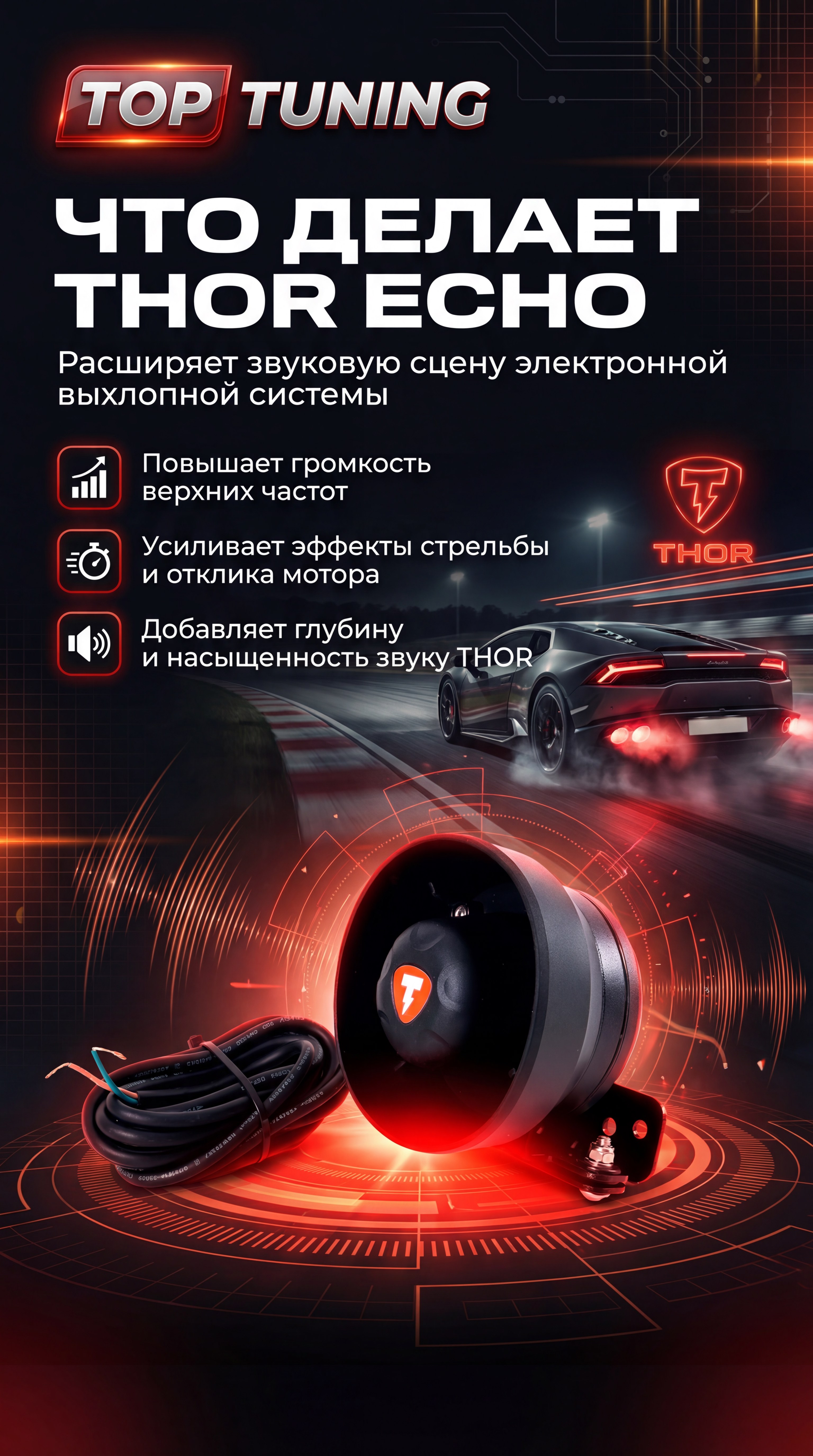 THOR ECHO — специализированный высокочастотный генератор звука, разработанный как дополнительный элемент электронной выхлопной системы THOR 2.0. Данный динамик отвечает за формирование верхнего диапазона звучания, обеспечивая детальность, резкость и выразительность звуковых сцен, недоступных в базовой конфигурации системы.