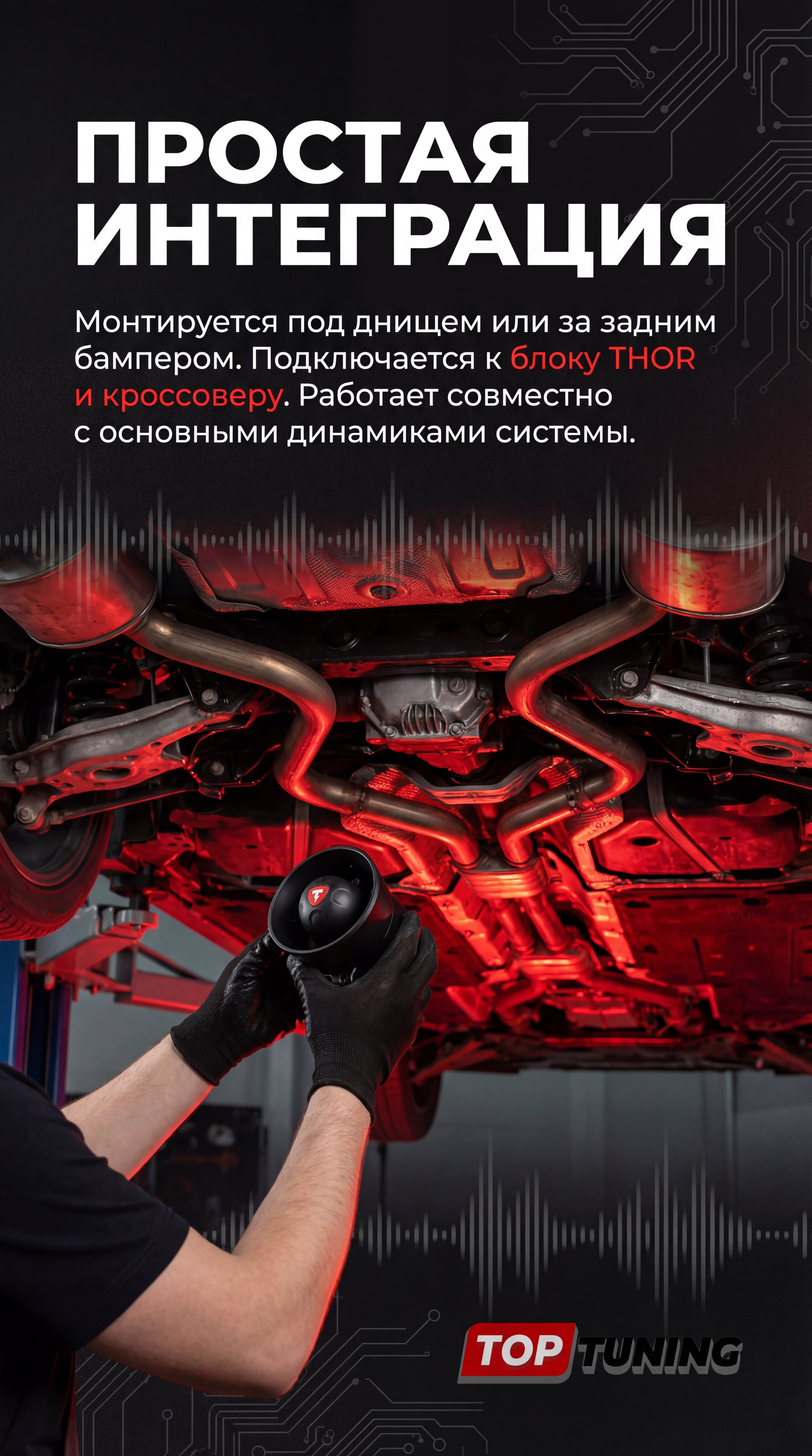 Кроссовер подключается непосредственно к электронному блоку управления THOR 2.0. Питание динамика прокладывается в салон через штатные технологические отверстия автомобиля и подключается согласно схеме производителя.